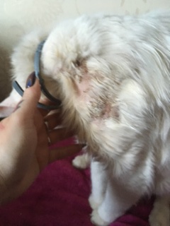 White female in an awful condition with a serious skin allergy on most of her body - despite many hundreds of pounds spent by the original owners via several Veterinary practices including a specialist a cure was not found, This girl has had to wear a t shirt and a collar for many years as a preventative to constantly scratching and injuring herself even more - imagine that! constant itching and unable to scratch. This girl has been re-homed and within 2 weeks has been turned around - no more t shirt or collar and her coat is growing back. Thank you Claire you have done a wonderful job with her. It is these times which makes rescue and welfare worthwhile. Before